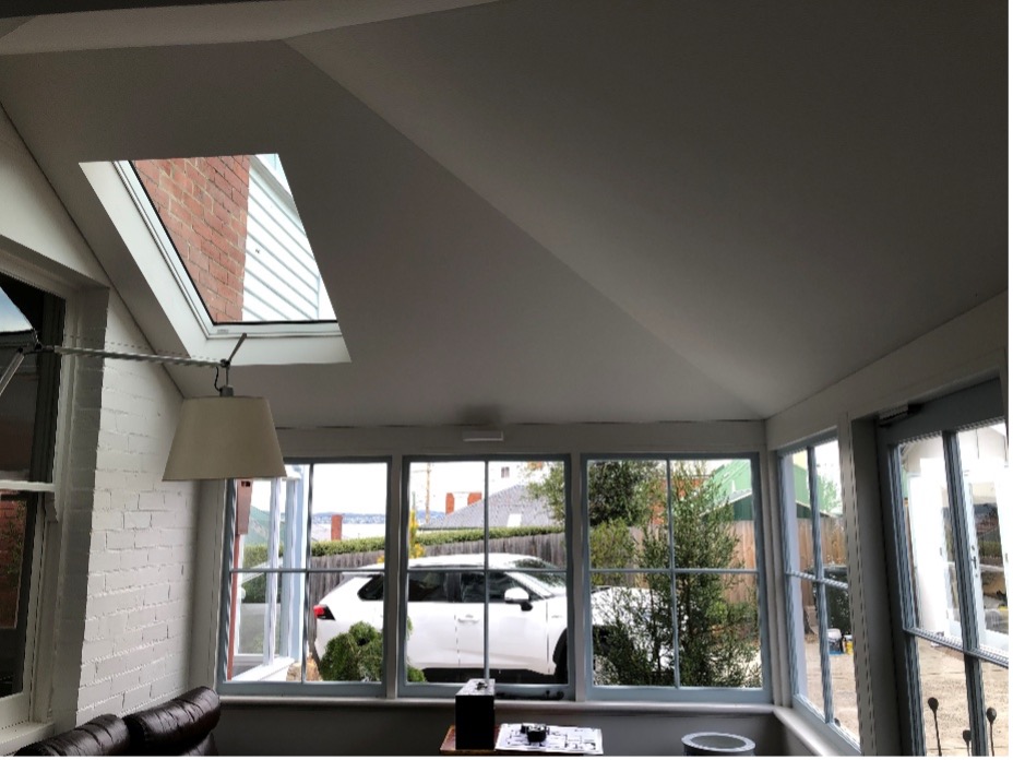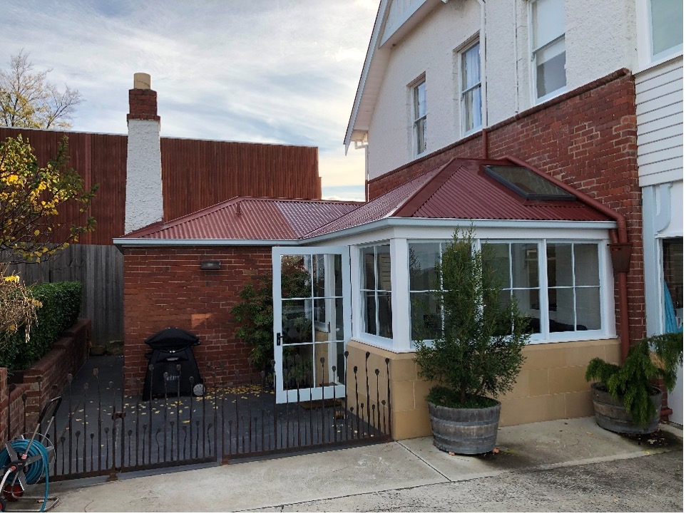 Our vision for Laroona was to create a modest extension with minimal detailing. One that complimented the original heritage listed design, while also capitalising on Tasmania’s unique light. This yielded a new sunroom for the clients to bask in, its interiors lined with Tasmanian Oak for warmth and maximum light without the glare. Taking its cues from the existing pitched roof, our design places skylights and windows throughout to reconnect spaces and let light pour in. Timber framing performs a similar role in two ways: by paying homage to the original back door and window, now a working back entrance to the home, and matching the horizontal lines of the original corbelled brickwork.